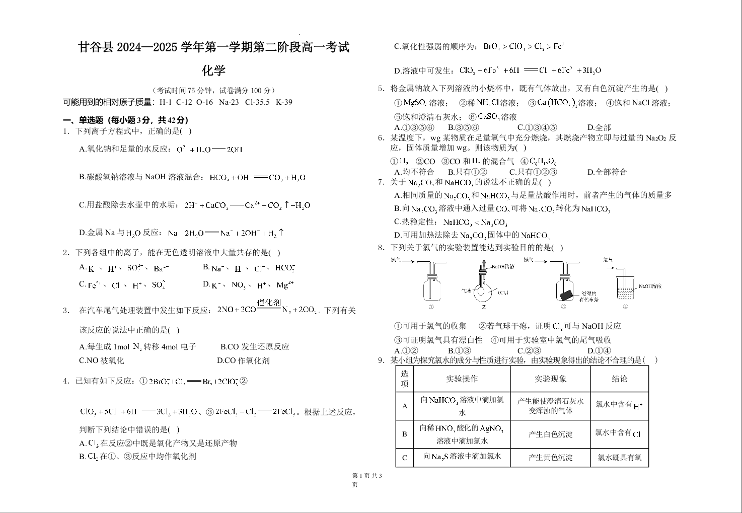 甘肃省天水市甘谷县2024-2025学年高一上学期11月联考化学