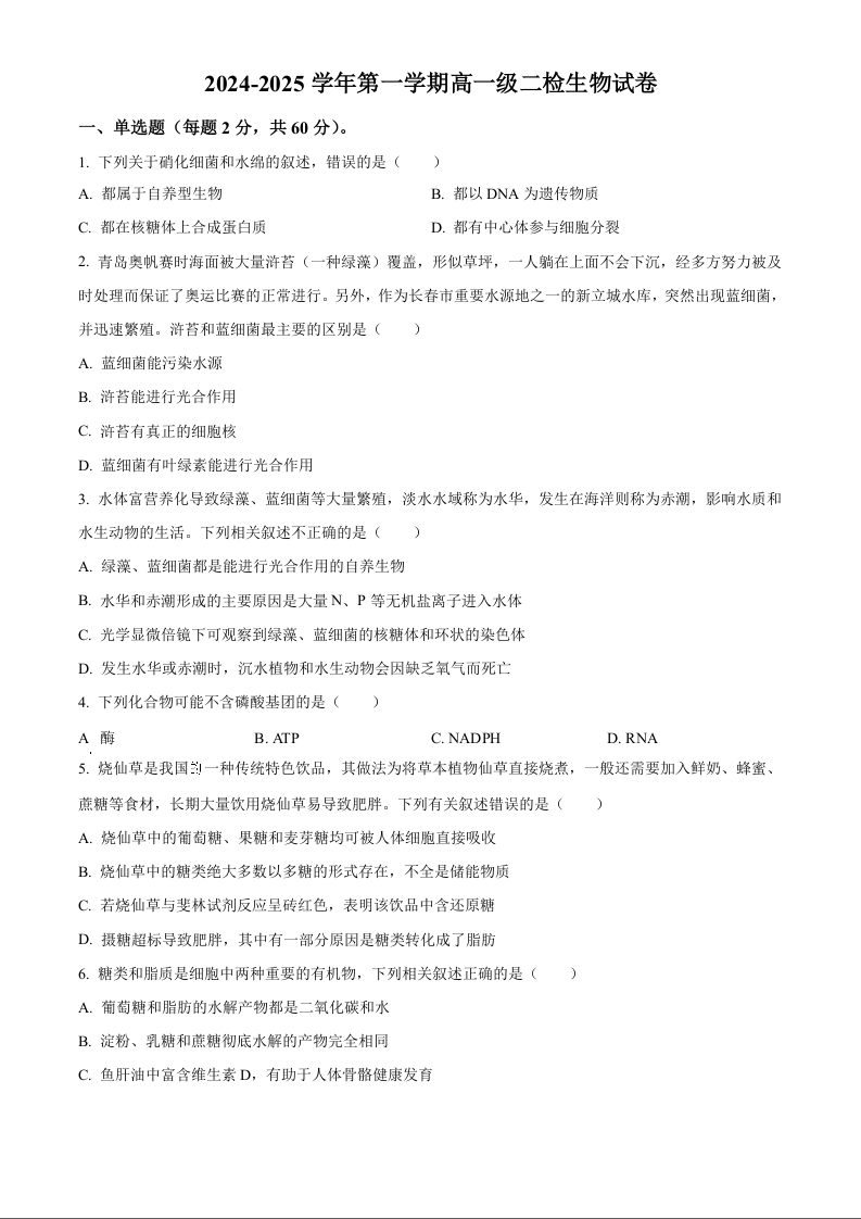 甘肃省天水市甘谷县2024-2025学年高一上学期11月联考生物(原卷版)