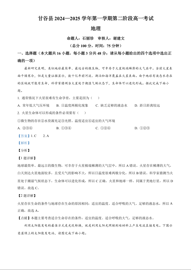 甘肃省天水市甘谷县2024-2025学年高一上学期11月联考地理(解析版)