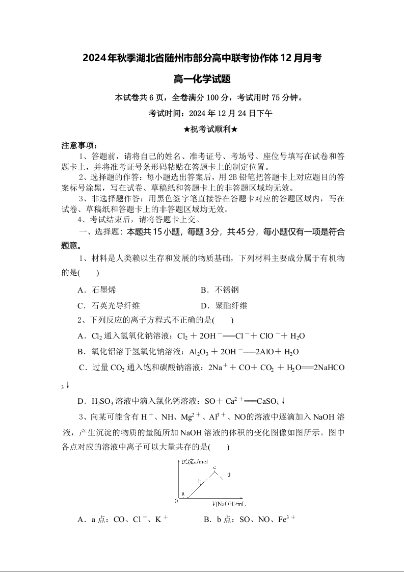 湖北省随州市部分高中2024-2025学年高一上学期12月联考化学