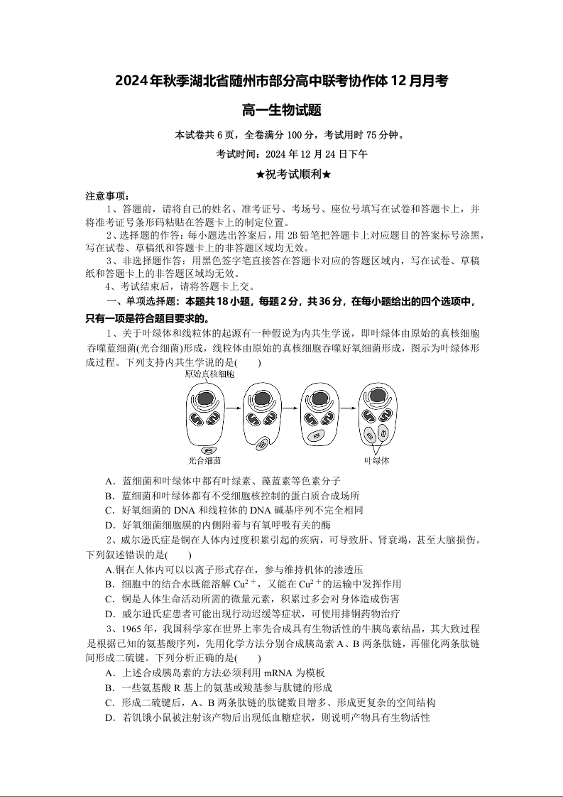 湖北省随州市部分高中2024-2025学年高一上学期12月联考生物