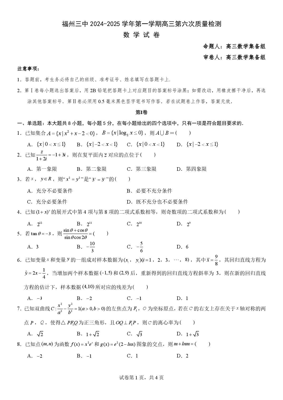 福建省福州市第三中学2025届高三上学期第六次质量检测数学