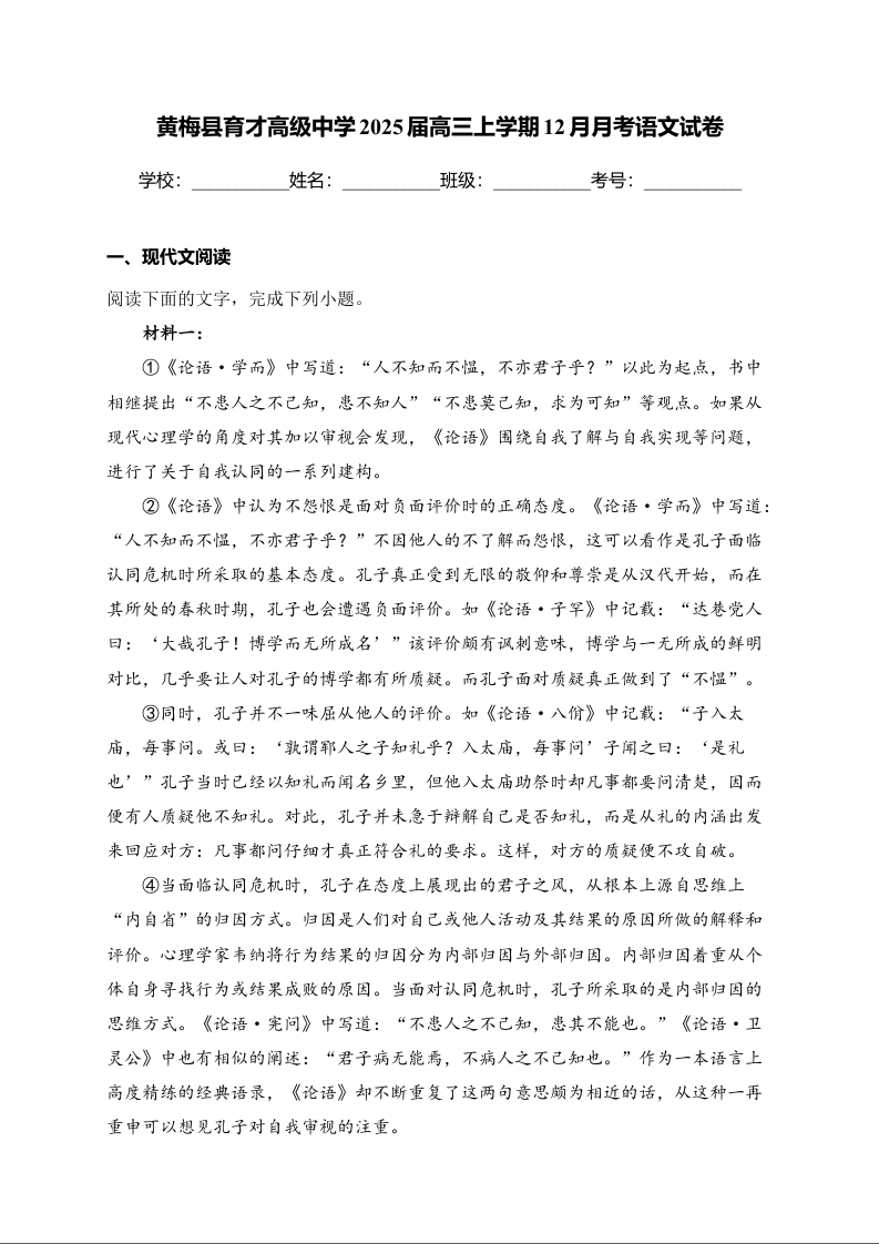 湖北省黄冈市黄梅县育才高级中学2025届高三12月核心模拟预测语文+答案