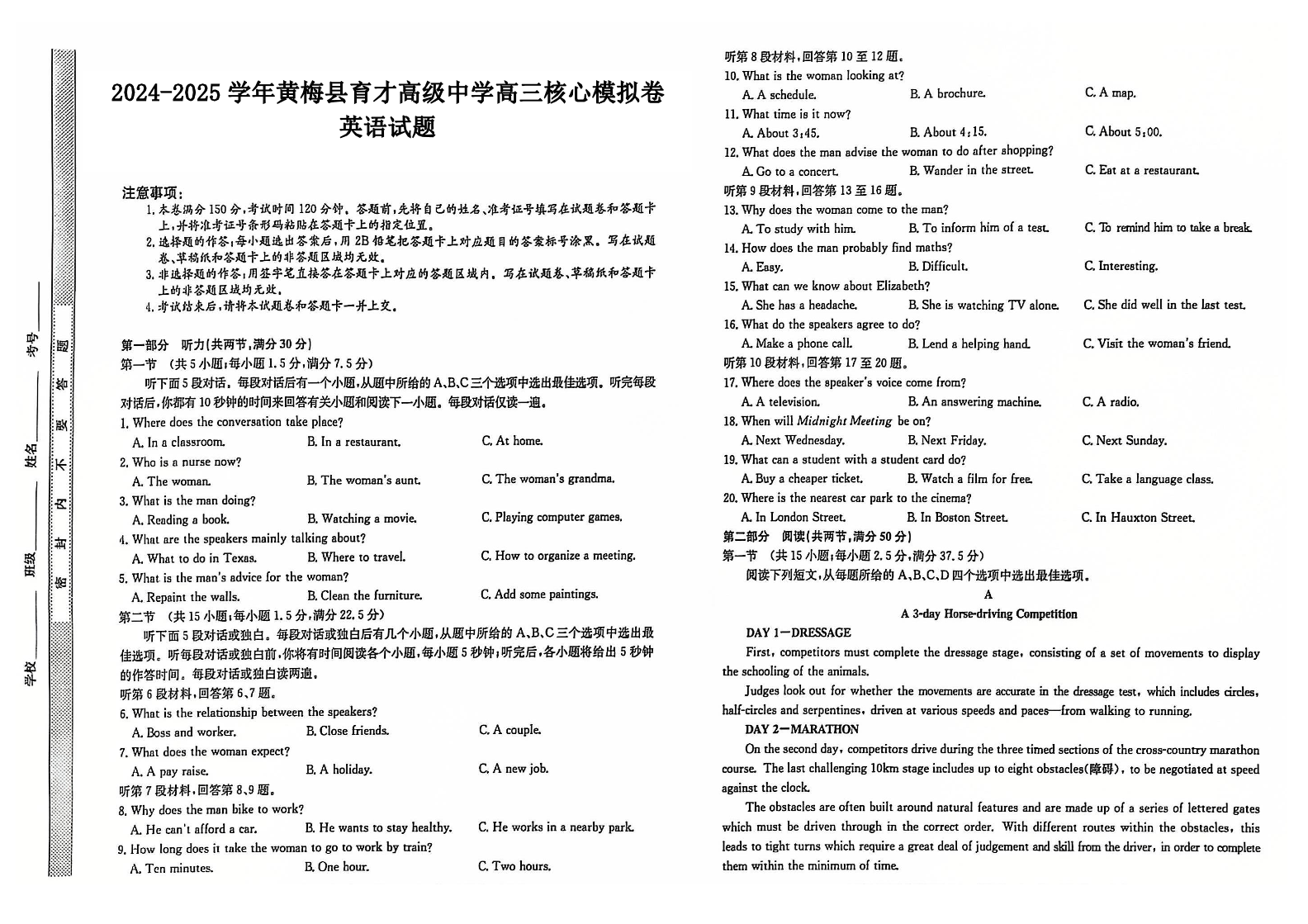 湖北省黄冈市黄梅县育才高级中学2025届高三12月核心模拟预测英语