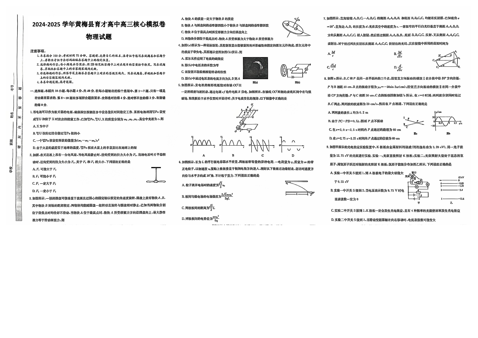 湖北省黄冈市黄梅县育才高级中学2025届高三12月核心模拟预测物理