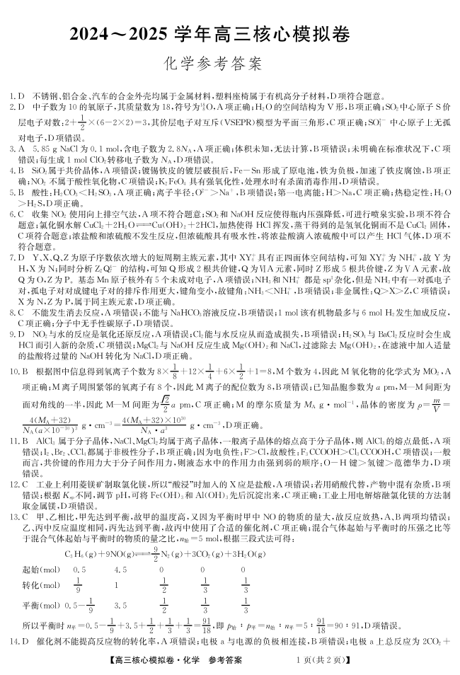 湖北省黄冈市黄梅县育才高级中学2025届高三12月核心模拟预测化学答案