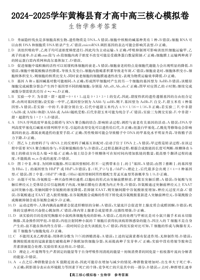 湖北省黄冈市黄梅县育才高级中学2025届高三12月核心模拟预测生物答案