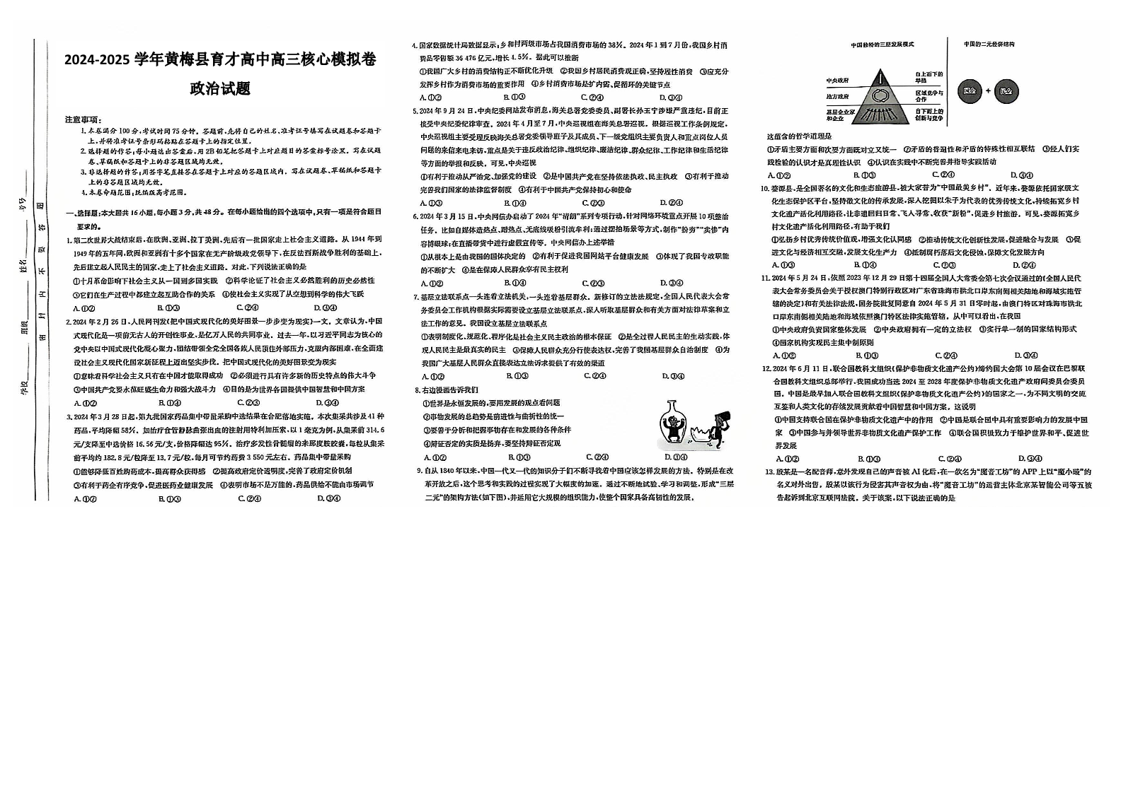 湖北省黄冈市黄梅县育才高级中学2025届高三12月核心模拟预测政治
