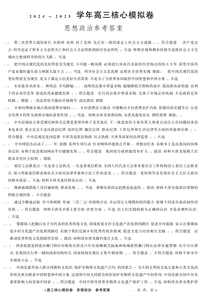 湖北省黄冈市黄梅县育才高级中学2025届高三12月核心模拟预测政治答案