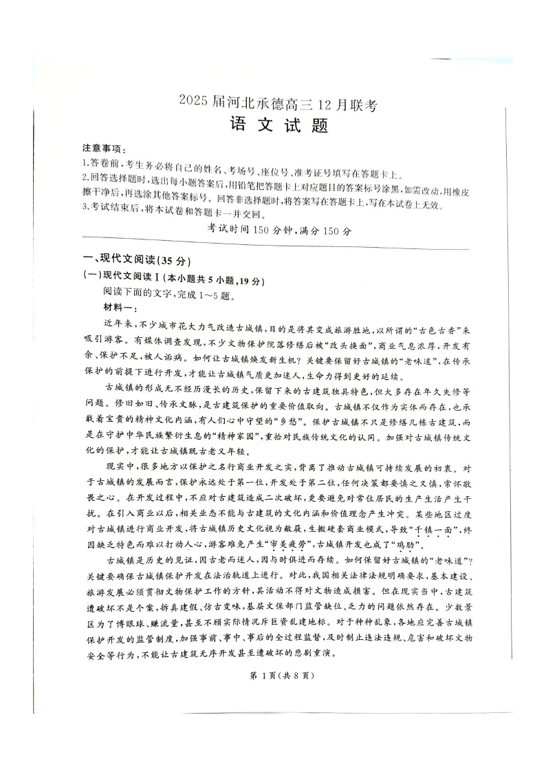 河北省承德市2025届高三上学期12月联考语文