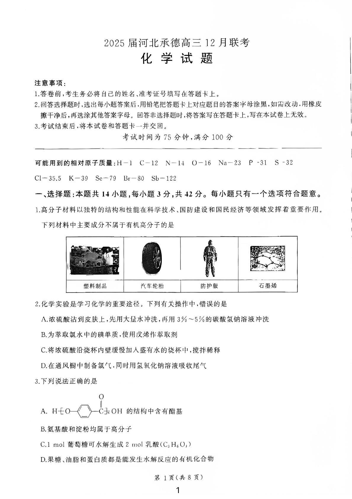 河北省承德市2025届高三上学期12月联考化学
