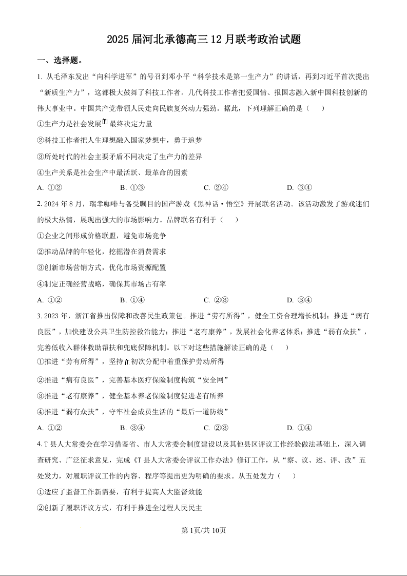 河北省承德市2025届高三上学期12月联考政治+答案