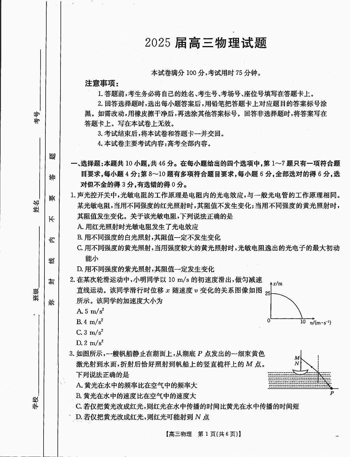 四川省区域部分高中2025届高三上学期12月联考物理