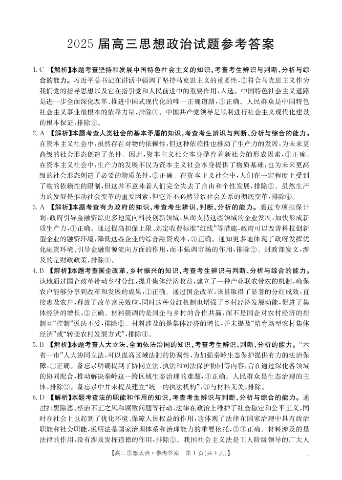 四川省区域部分高中2025届高三上学期12月联考政治答案
