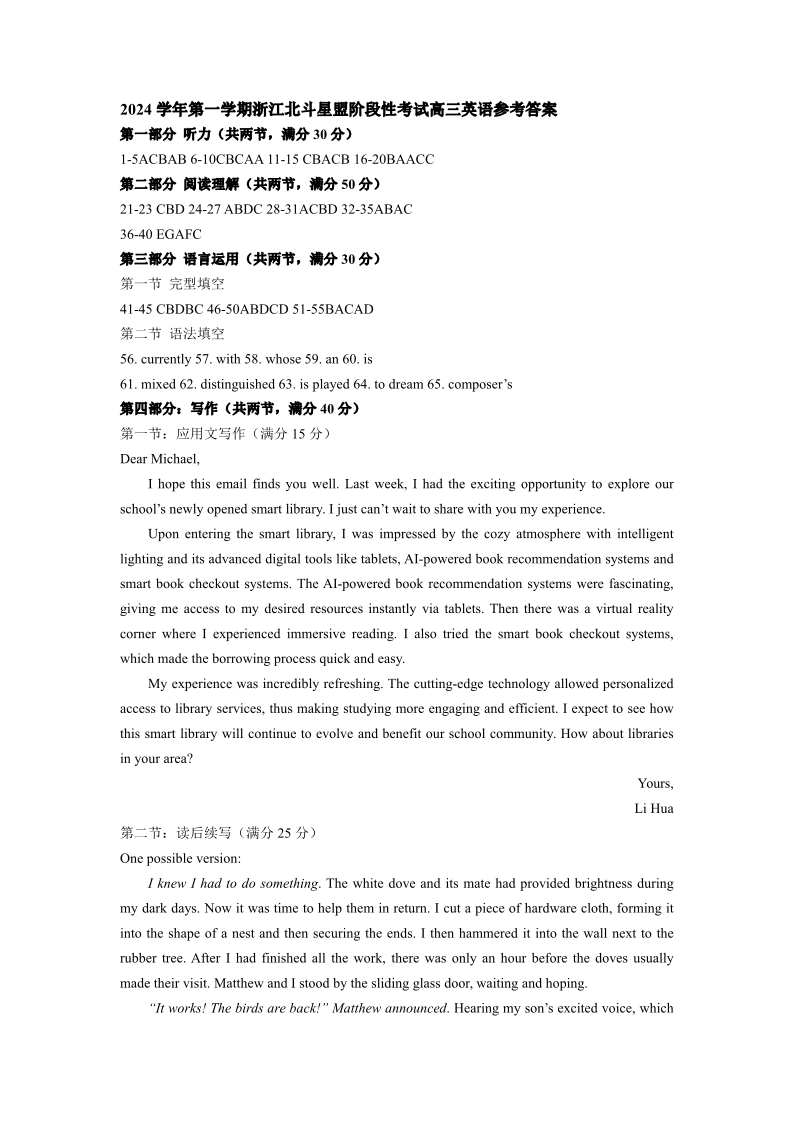 浙江省北斗星盟2025届高三上学期12月适应性考试英语答案
