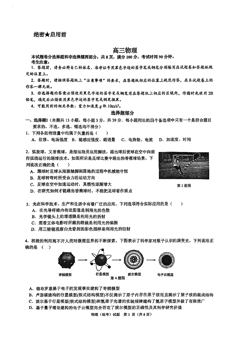 浙江省北斗星盟2025届高三上学期12月适应性考试物理+答案