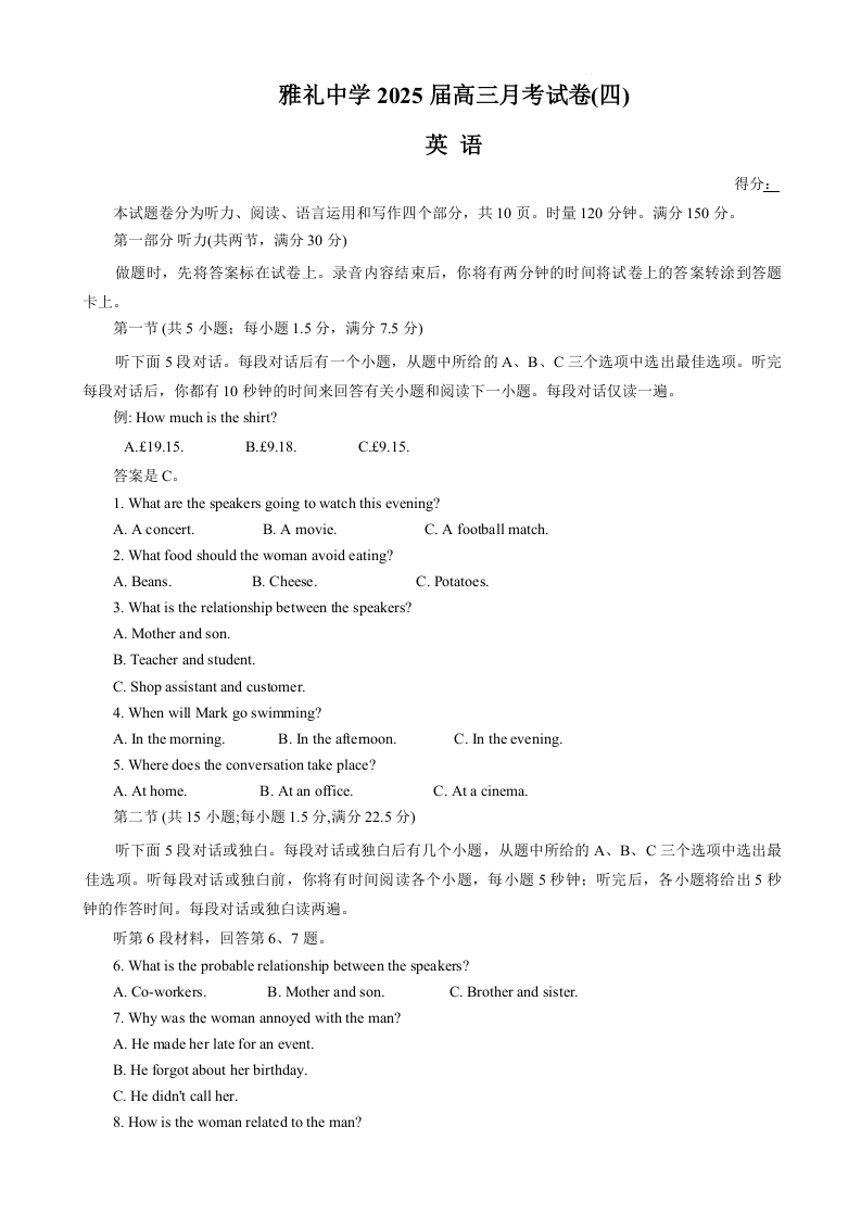 湖南省长沙市雅礼中学2025届高三上学期月考(四)英语