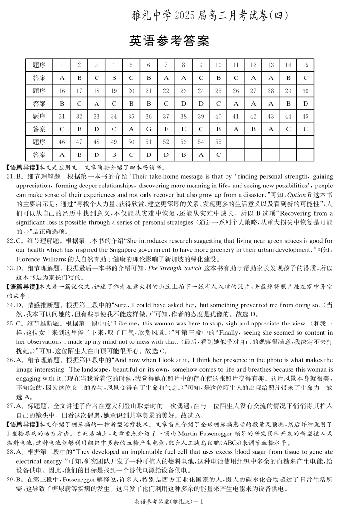 湖南省长沙市雅礼中学2025届高三上学期月考(四)英语答案