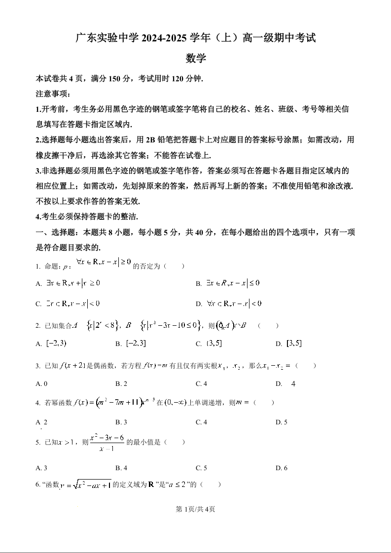 广东省实验中学2024-2025学年高一上学期期中考试数学(原卷版)