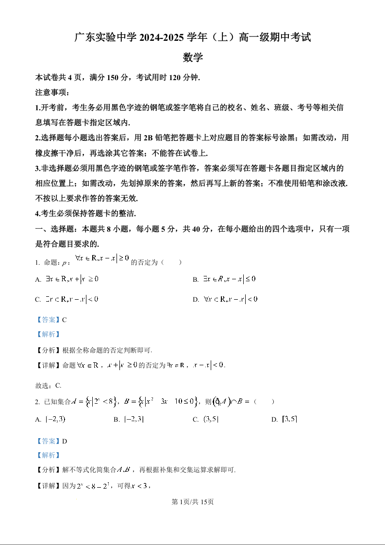 广东省实验中学2024-2025学年高一上学期期中考试数学(精品解析版)
