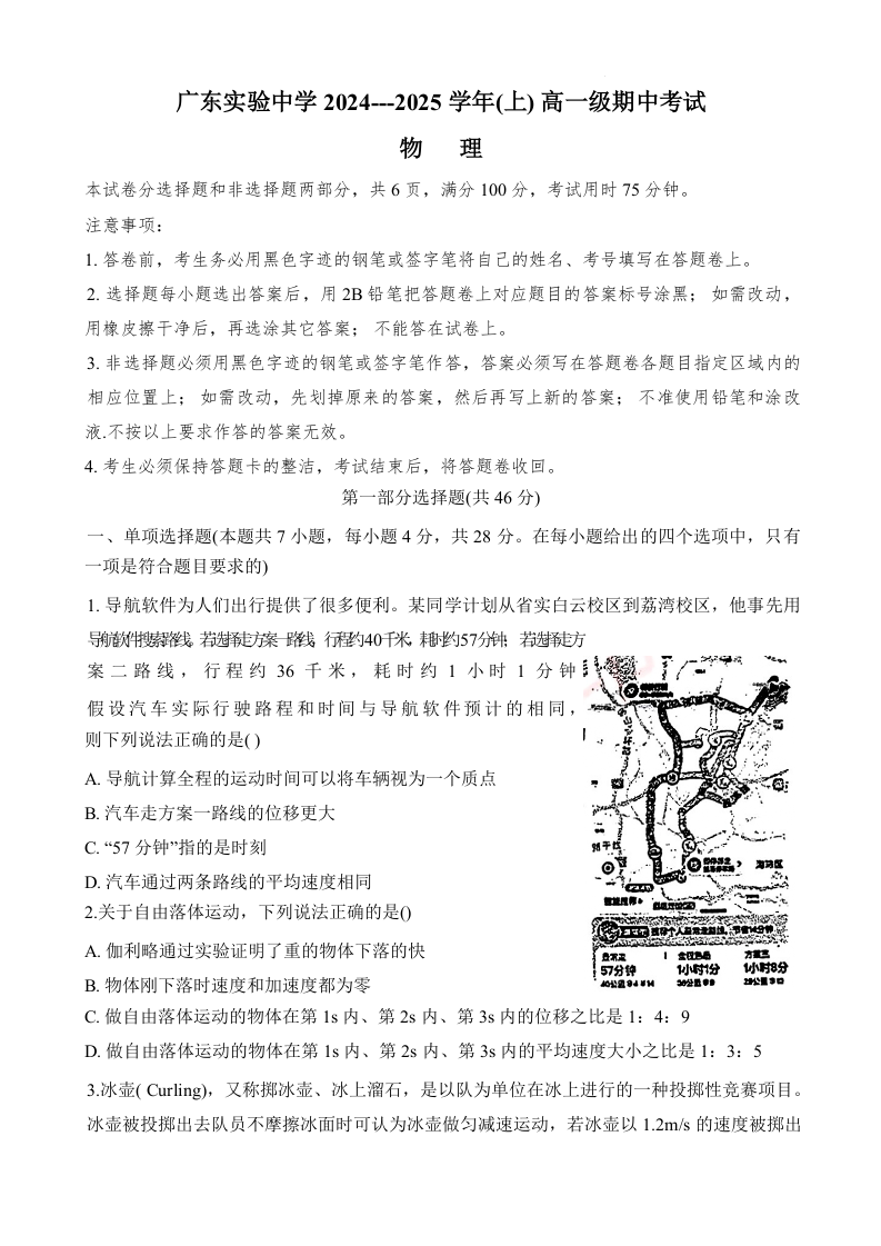广东省实验中学2024-2025学年高一上学期期中考试物理+答案