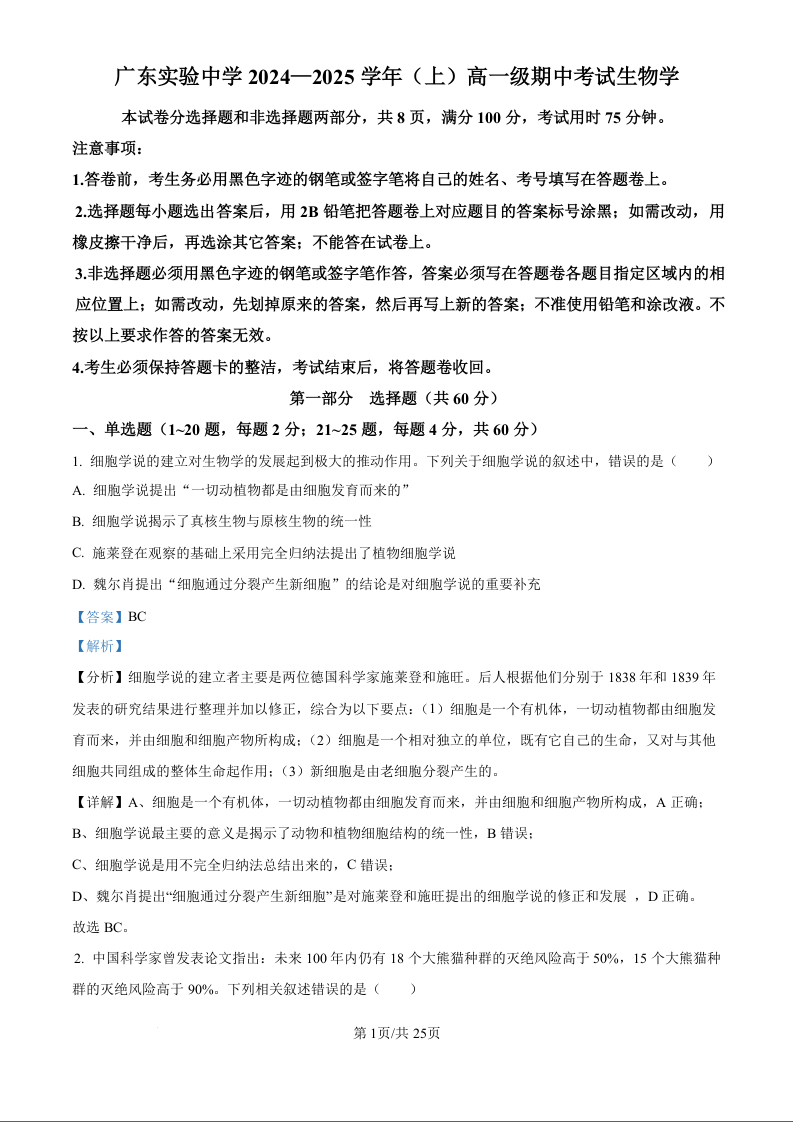 广东省实验中学2024-2025学年高一上学期期中考试生物(精品解析版)