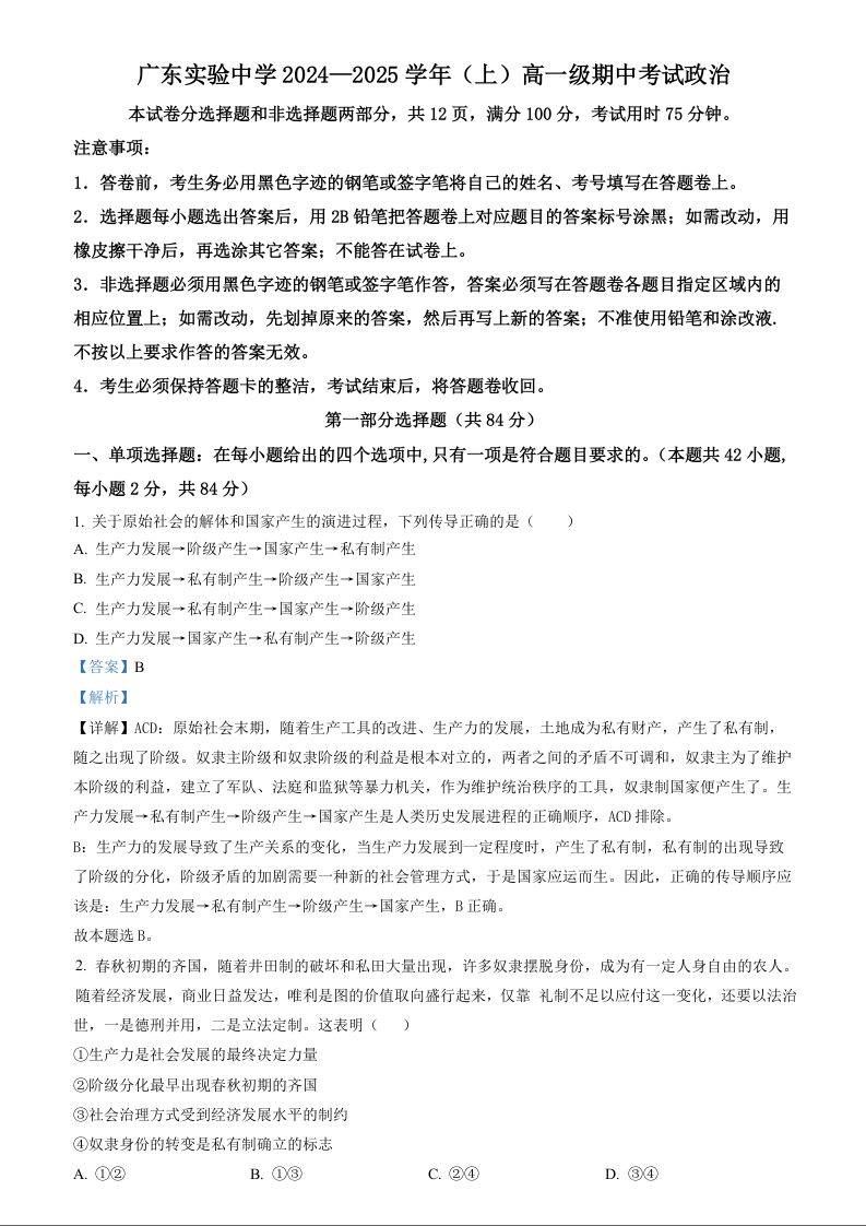 广东省实验中学2024-2025学年高一上学期期中考试政治(精品解析版)