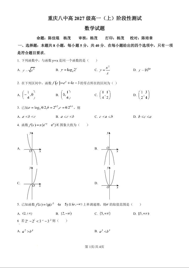 重庆市第八中学2024-2025学年高一上学期12月阶段性测试数学(原卷版)