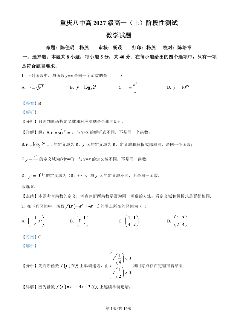 重庆市第八中学2024-2025学年高一上学期12月阶段性测试数学(精品解析版)