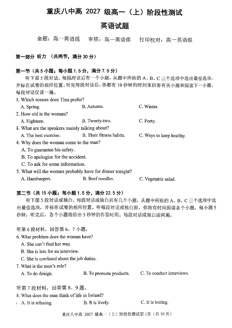 重庆市第八中学2024-2025学年高一上学期12月阶段性测试英语