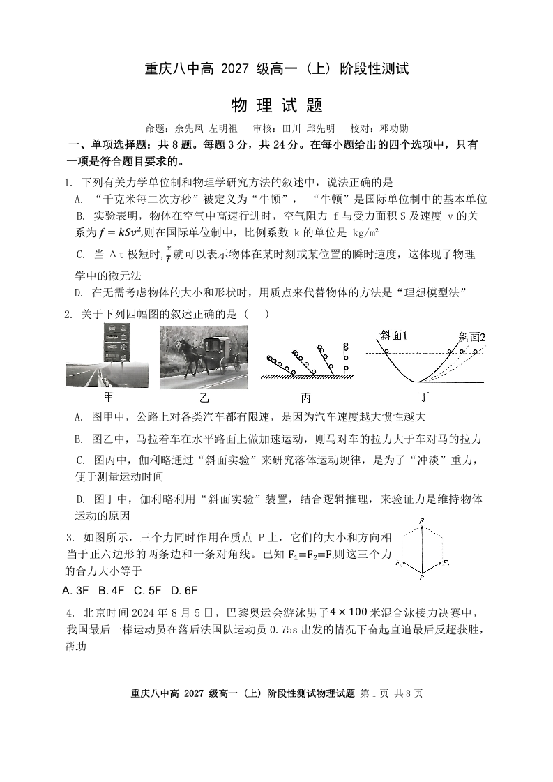 重庆市第八中学2024-2025学年高一上学期12月阶段性测试物理