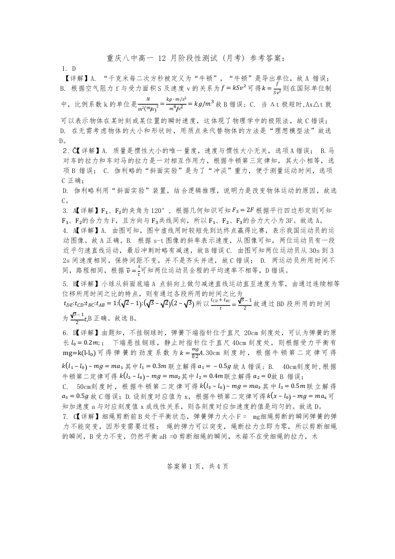 重庆市第八中学2024-2025学年高一上学期12月阶段性测试物理答案