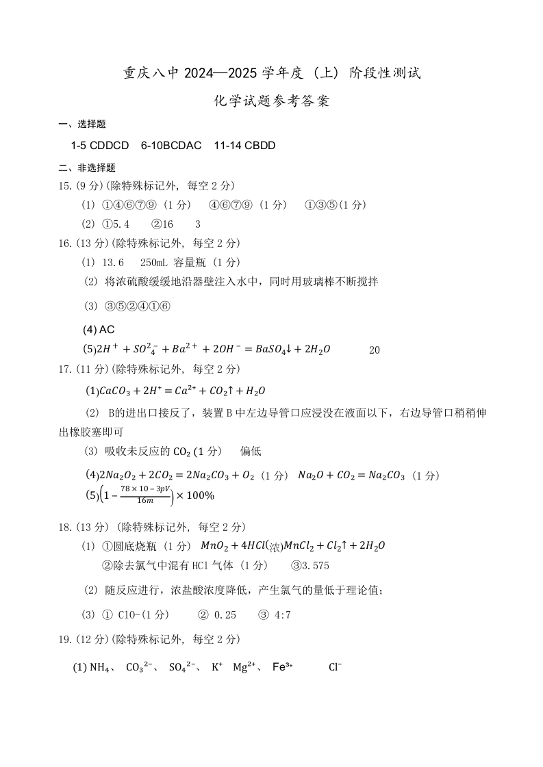 重庆市第八中学2024-2025学年高一上学期12月阶段性测试化学答案