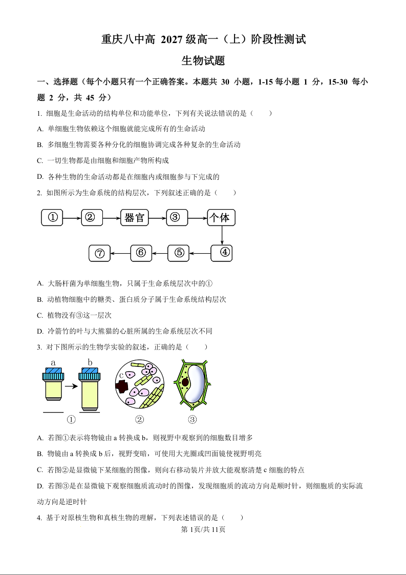 重庆市第八中学2024-2025学年高一上学期12月阶段性测试生物(原卷版)