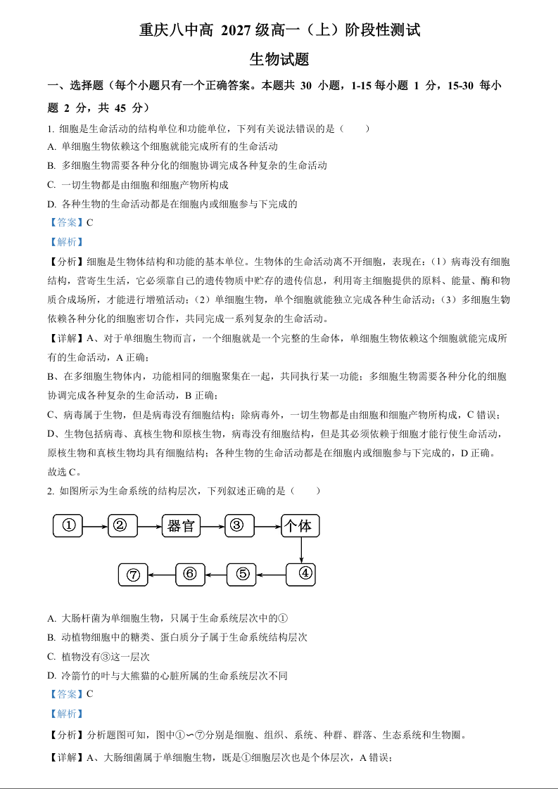 重庆市第八中学2024-2025学年高一上学期12月阶段性测试生物(精品解析版)