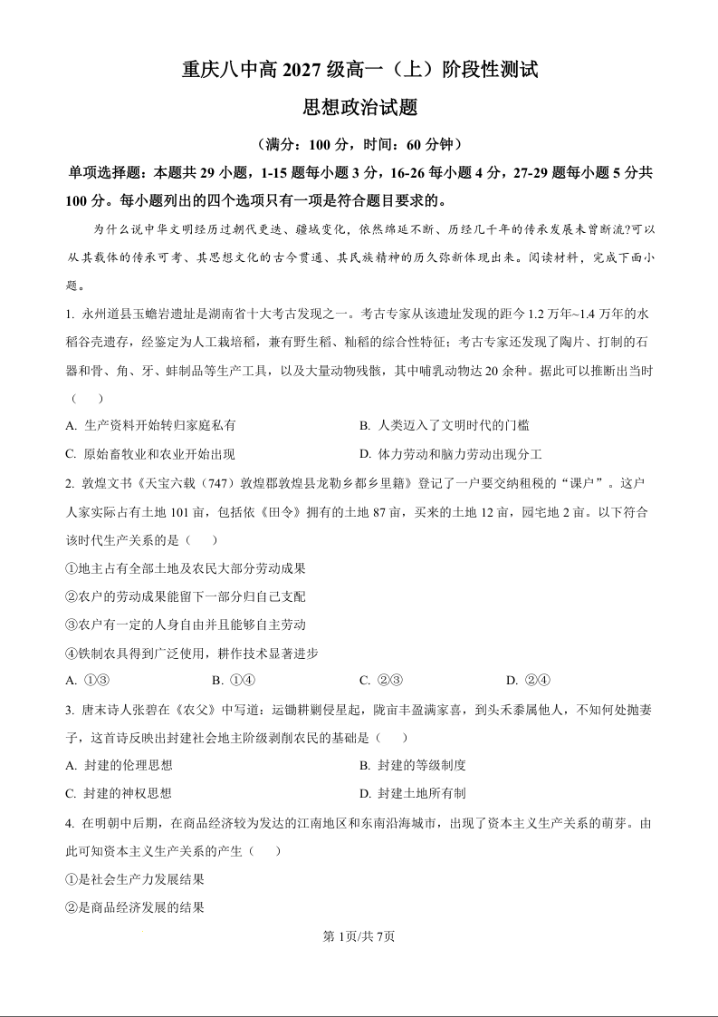 重庆市第八中学2024-2025学年高一上学期12月阶段性测试政治(原卷版)