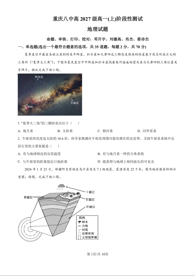 重庆市第八中学2024-2025学年高一上学期12月阶段性测试地理(原卷版)