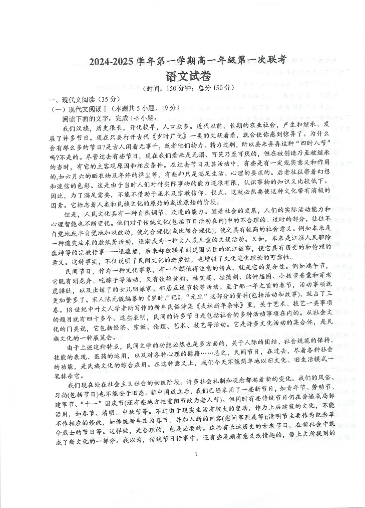 江苏省泰州中学等校2024-2025学年高一上学期12月联合考试语文+答案