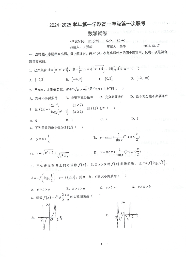 江苏省泰州中学等校2024-2025学年高一上学期12月联合考试数学+答案