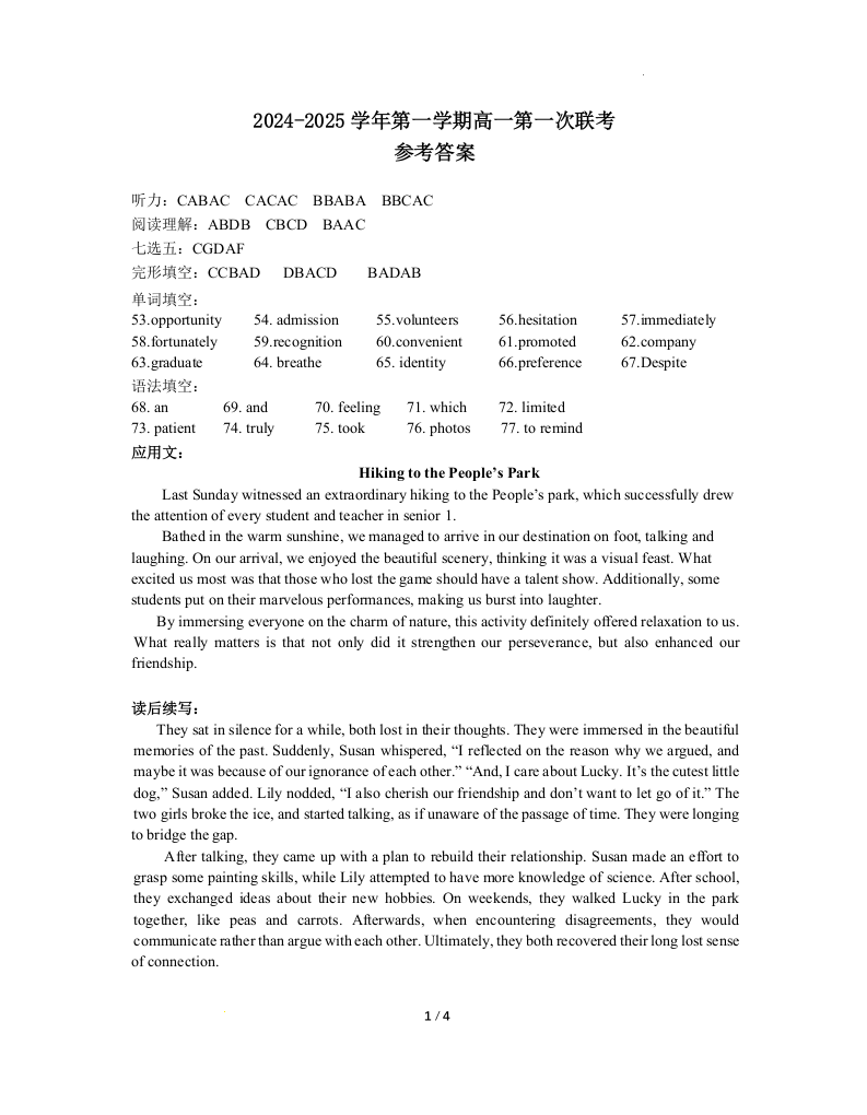 江苏省泰州中学等校2024-2025学年高一上学期12月联合考试英语答案