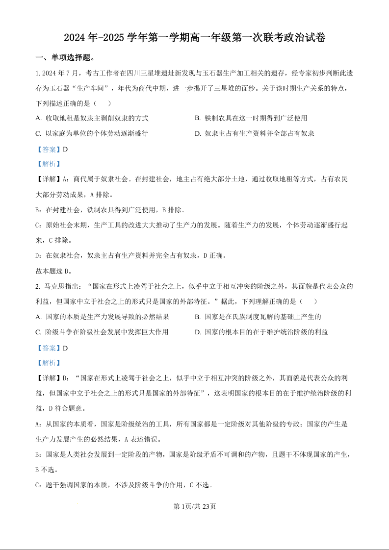 江苏省泰州中学等校2024-2025学年高一上学期12月联合考试政治(精品解析版)
