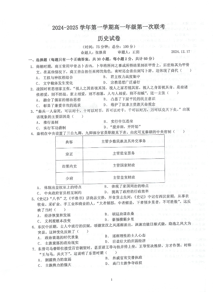 江苏省泰州中学等校2024-2025学年高一上学期12月联合考试历史+答案