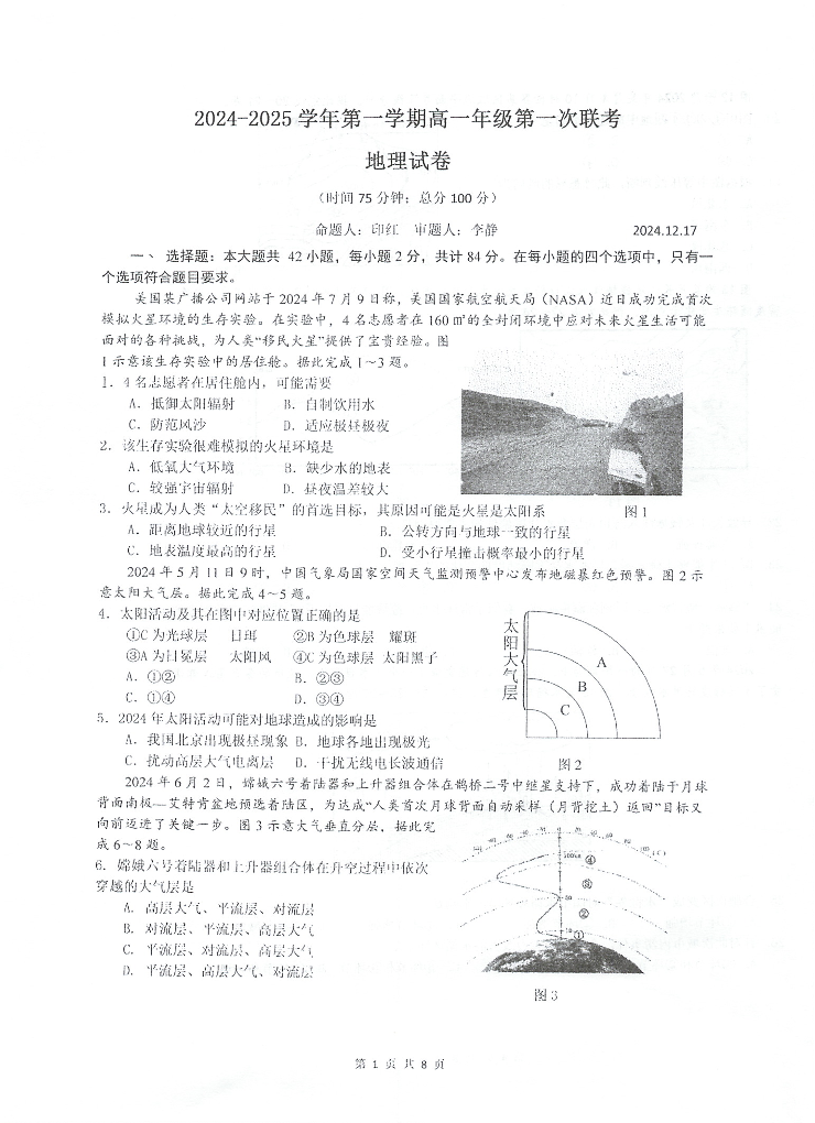 江苏省泰州中学等校2024-2025学年高一上学期12月联合考试地理