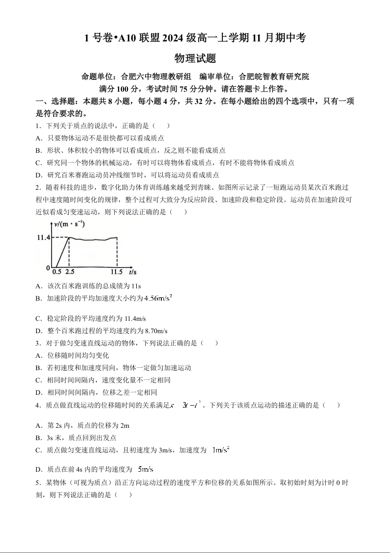 安徽省A10联盟2024级高一上学期11月期中考物理+答案