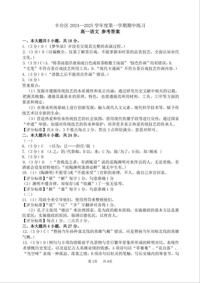 北京市丰台区2024-2025学年度第一学期期中练习语文答案