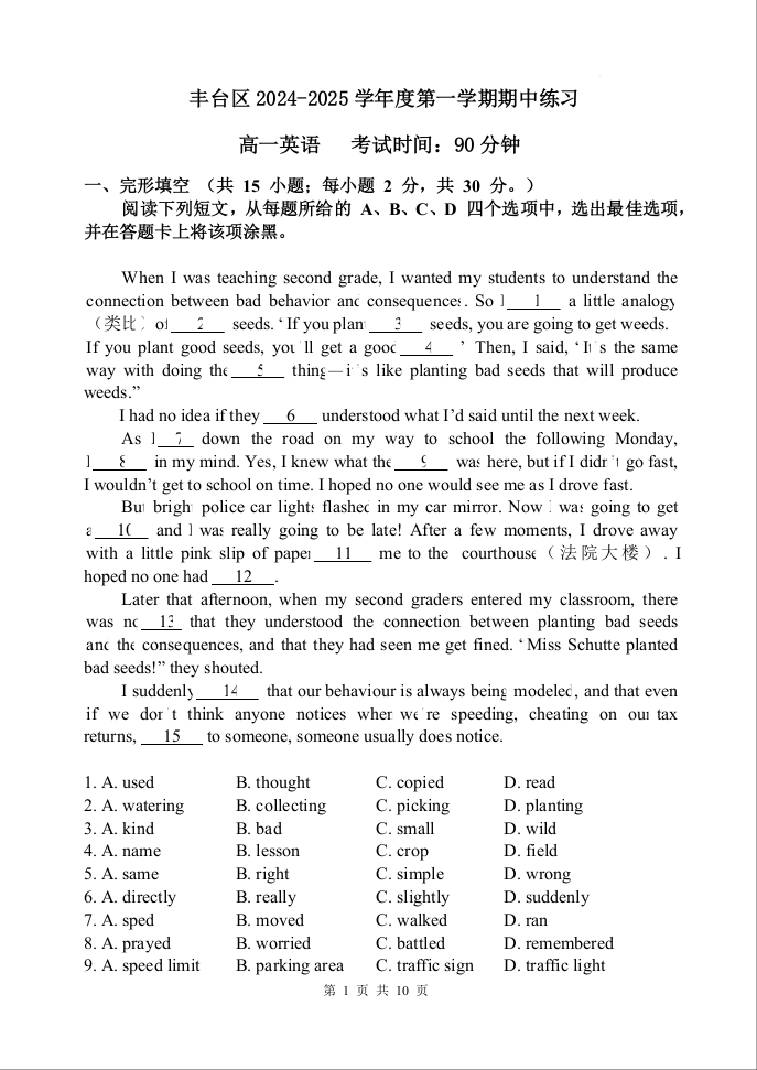 北京市丰台区2024-2025学年度第一学期期中练习英语