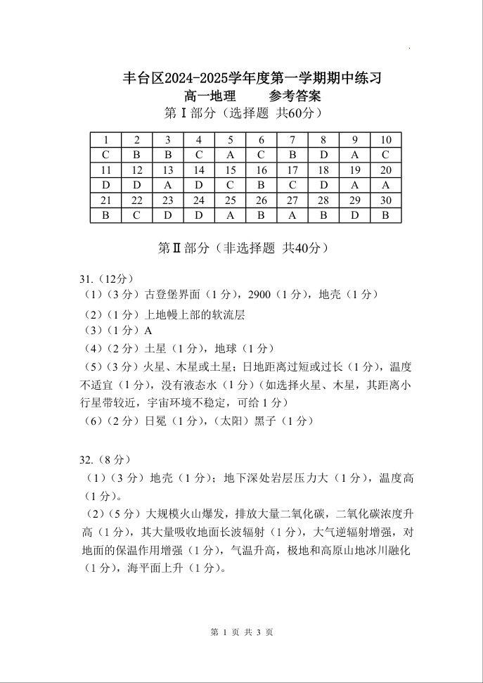 北京市丰台区2024-2025学年度第一学期期中练习地理答案