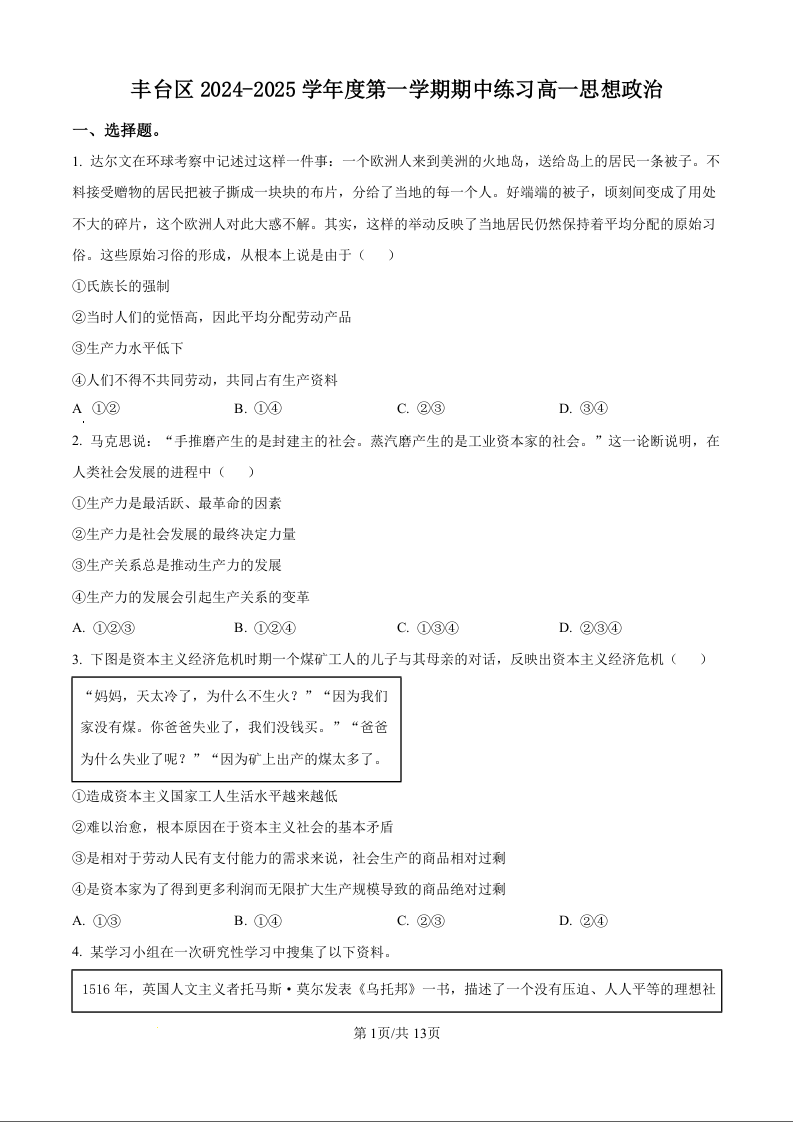 北京市丰台区2024-2025学年度第一学期期中练习政治试题(原卷版)