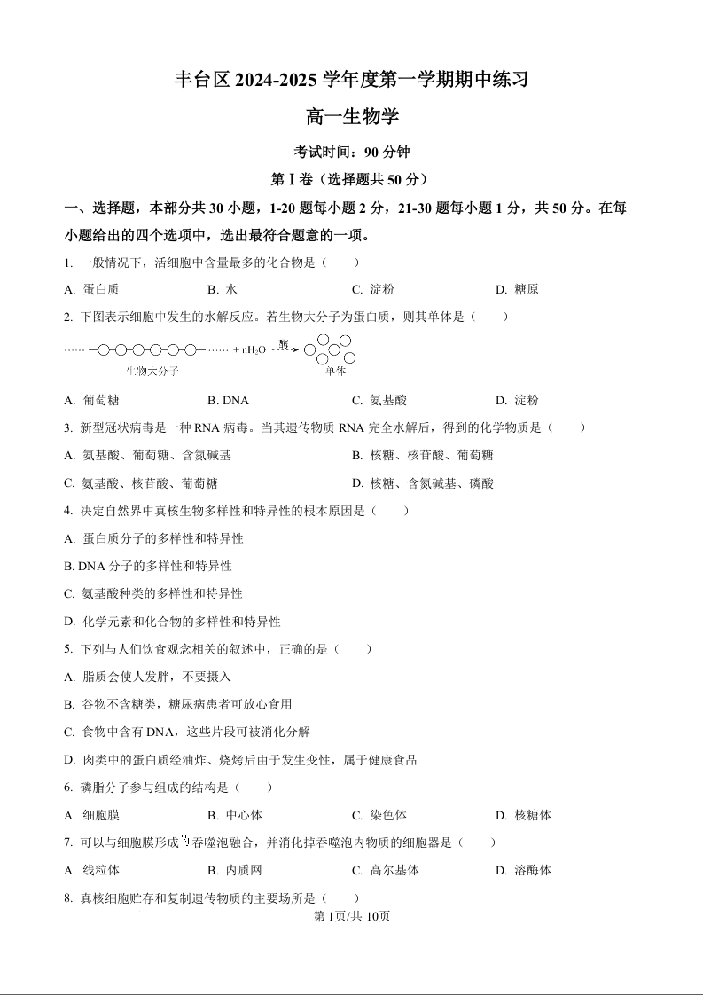 北京市丰台区2024-2025学年度第一学期期中练习生物试题(原卷版)