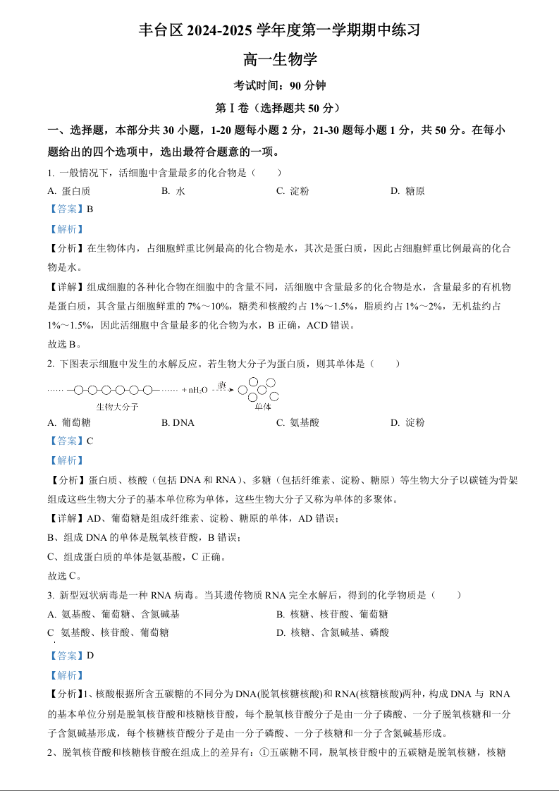 北京市丰台区2024-2025学年度第一学期期中练习生物试题(解析版)